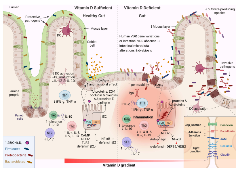 Vitamine D et muqueuse de la barrière  intestinale : La muqueuse intestinale sert à la fois de barrière physique et fonctionnelle séparant les cellules hôtes du microenvironnement. Il se compose de plusieurs composants qui travaillent ensemble pour remplir sa fonction, tels que le microbiote intestinal commensal, une couche de mucus externe, l’immunoglobuline A sécrétoire et les AMP sécrétés dans la couche de mucus en tant que molécules de détection immunitaire et protéines régulatrices. La couche de cellules épithéliales spécialisées et la lamina propria interne contribuent également à cette fonction. Les cellules épithéliales de l’intestin forment une monocouche et sont étroitement reliés par des structures symétriques appelées complexes jonctionnels. Les jonctions serrées (TJ pour tights junctions) sont situées du côté apical des cellules et sont responsables du transport des ions et de la régulation des petites molécules. Le tissu lymphoïde associé à l’intestin est impliqué dans l’immunité adaptative et innée et se compose de cellules B, de cellules T, de macrophages et de cellules dendritiques, qui contribuent de manière essentielle aux mécanismes de défense immunologiques de la barrière intestinale. La signalisation vitamine D-VDR aide à maintenir l’intégrité de la barrière intestinale en régulant la chaîne légère de la myosine kinase et offre une protection en empêchant l’amplificateur de chaîne légère du facteur nucléaire kappa des cellules B activées (NF-κb) par la stimulation MLCK médiée